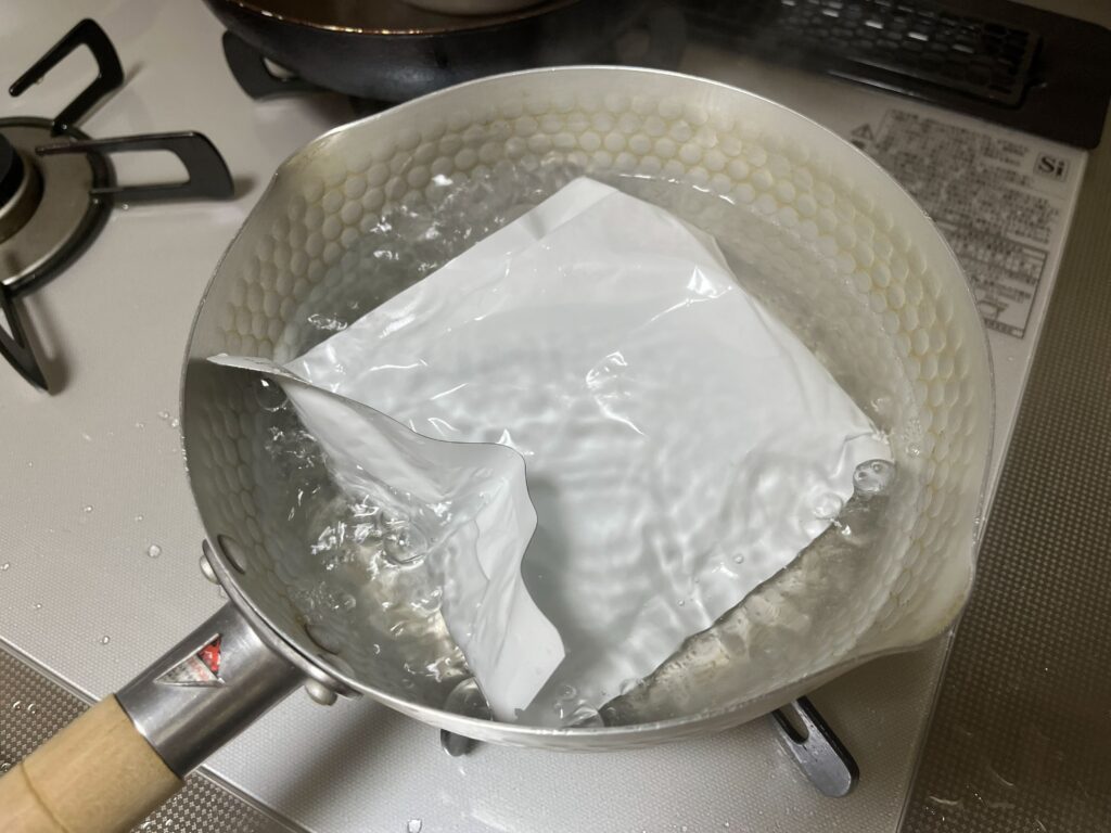 最近のレトルトカレーは、ケースのままレンジで温められるものも多いですが、ここのは湯煎するタイプです!